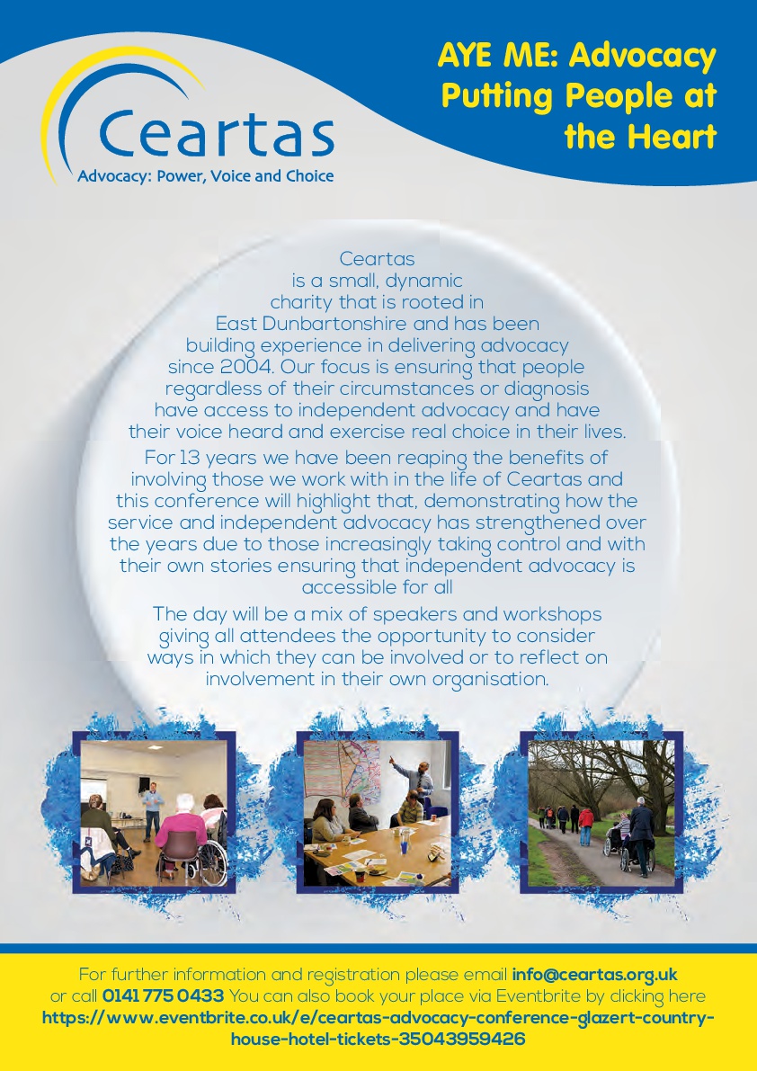 Aye Me: Advocacy putting people at the heart14 July, 2017Self Management Awards 201714 September, 2017 #AyeME Flyer Published by Ronnie Whiteside at 11 August, 2017 Categories Events News Tags Share Ronnie Whiteside Related postsPhoto by Tim Mossholder on Unsplash 14 April, 2026Vacancy at Ceartas: Chief OfficerRead morePhoto by Brady Jordan on Unsplash10 March, 2026We are recruiting: Advocacy WorkerRead more10 June, 2025#Ceartas21: Shining the spotlight on EDCABRead more Comments are closed.