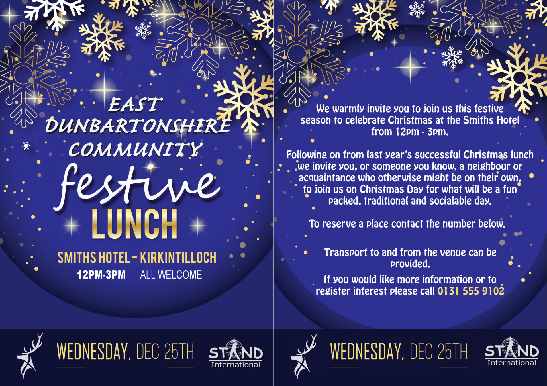 5 December, 2019After the success of previous years, our friends at Silver Stag & Stand International are running a Festive Lunch again on Christmas Day 2019.